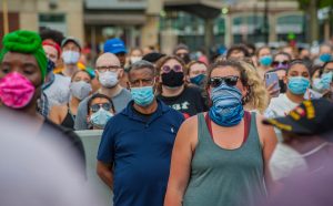 1) when BLACK LIVES MATTER protests broke out it was a challenge to cover them in the midst of the pandemic since social distancing was such as important aspect of protection many of my colleagues used long telephoto lenses in order to not get close to the action but my style is to be “in your face”/”up close & personal” solving that issue was an engineering problem I am covered head to toe with googles & masks & gloves & coat even in the heat I found this unique image where there were none of the typical signs being held overhead & the image concentrates on the health issues I was after south end, boston Massachusetts