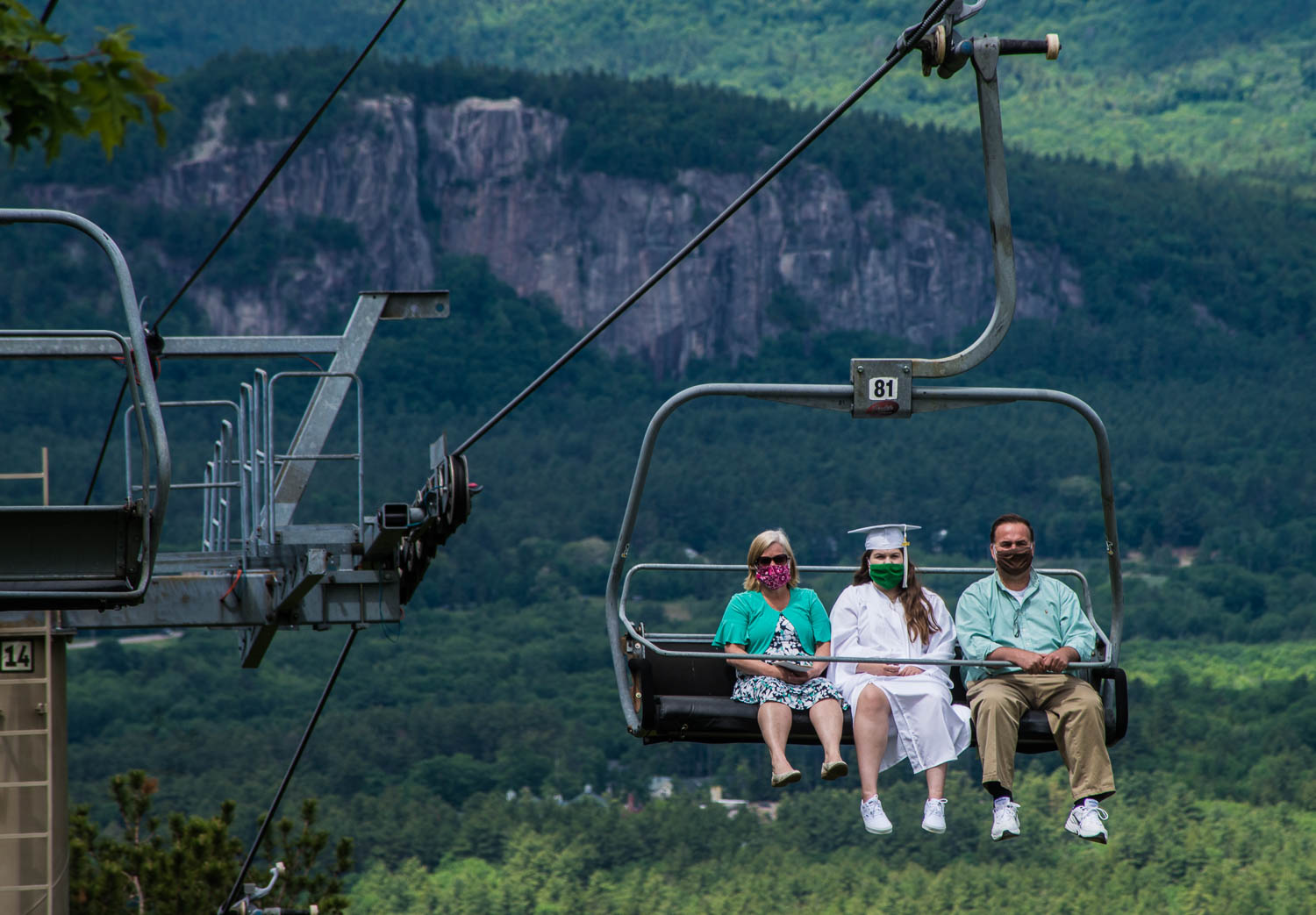 2) most schools had to cancel part of the semester & graduations were almost all virtual & on computers denying seniors of the pomp & circumstance but a few school systems came up with unique solutions this high school coordinated with the local ski resort to transport students & families to the top of the mountain one by one & present the diplomas with a beautiful valley background north conway, New Hampshire